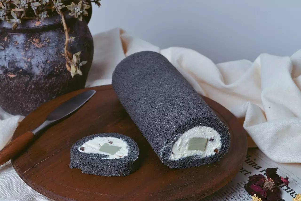 「抹茶奶冻竹炭卷」看似冷酷的外表下 隐藏着如少女心般柔软的口感 竹炭粉能清理肠胃 动物性淡奶油更健康 加上抹茶奶冻和一粒粒蜜豆 令口感更加丰富。。。