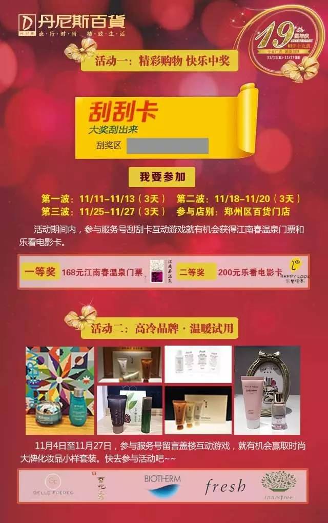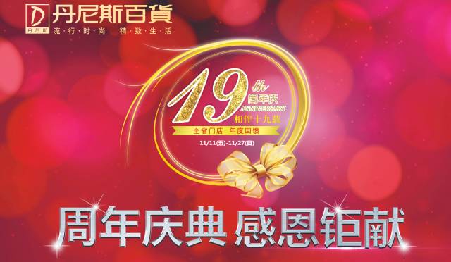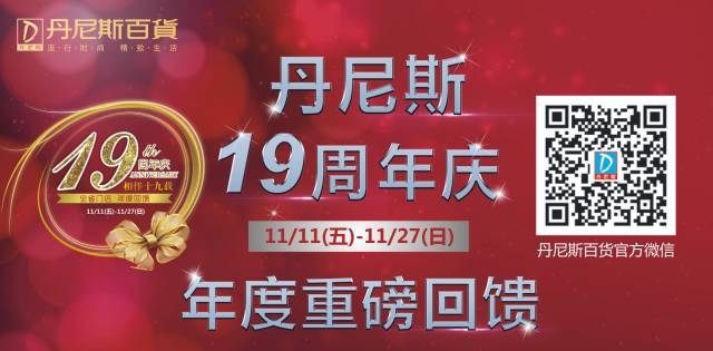 丹尼斯19周年庆,狂欢有惊喜!除了店内超大的折扣活动外,还将在线上推出各类超好玩的互动游戏,有丰厚的奖品哟!