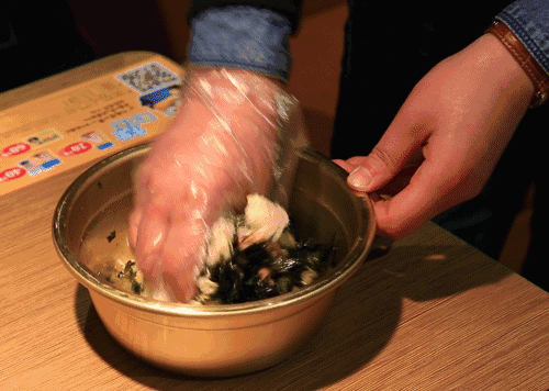 把芝士和排骨放进嘴里,用舌头把芝士绕在排骨上,再吃进去。