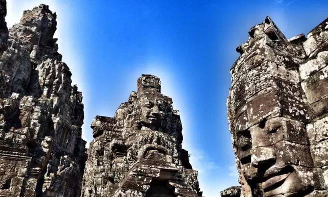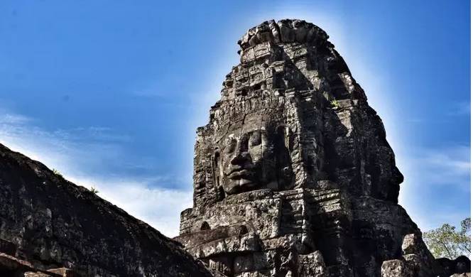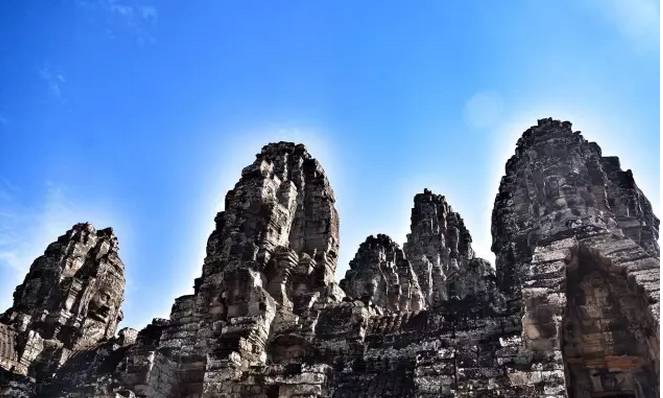由 54 座大大小小宝塔构成一座大宝塔的巴戎庙(高棉的微笑)。一块块巨大的石头堆砌后,雕刻而成。每个笑容之间都没有重复。