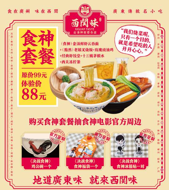 作为河南市场广式传统小吃的代表,西关味受邀阿里影业旗下淘票票进行深度合作,被授权河南地区宣传《决战食神》电影。