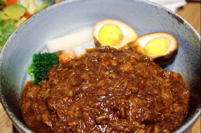 肥瘦各半的肉燥被浓厚的酱汁所包裹