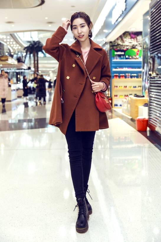 上身“宽”下身“窄”,才是展现大长腿的王道之法。妹子的棕色外套虽是宽松中长款,但紧身裤和小靴子立马拉长长腿,红色的链条小包也很可爱。