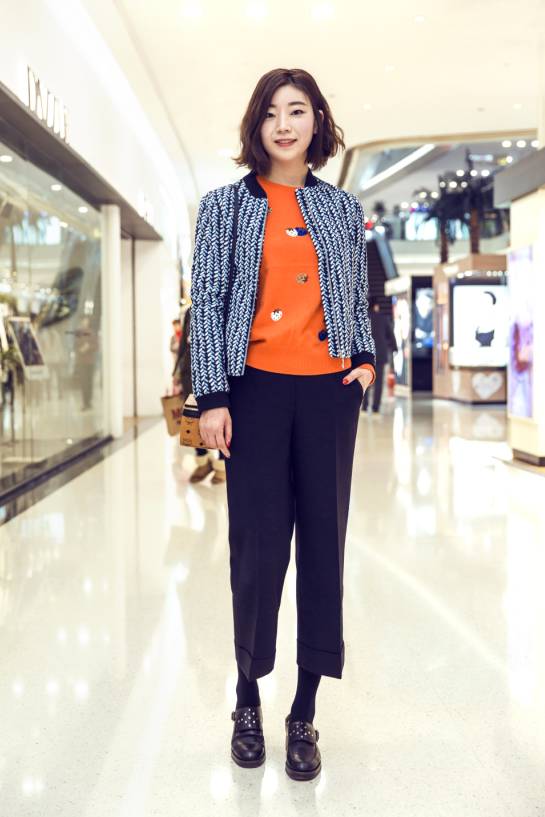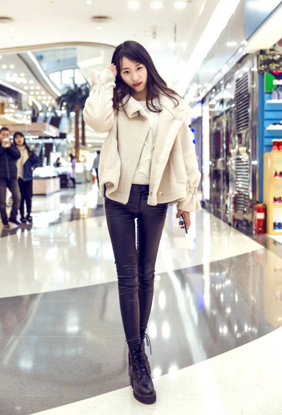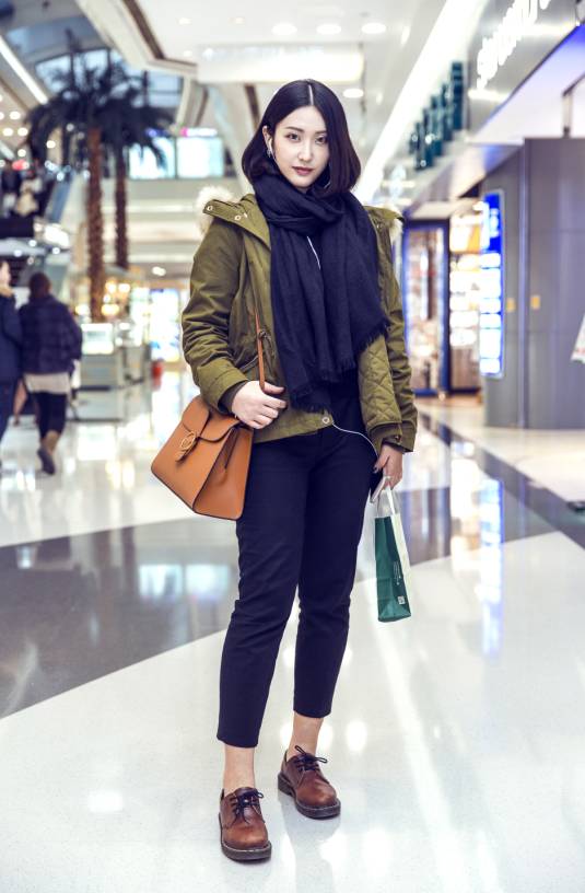 虽是初春但还有些冷,妹子围着围巾穿着稍厚的外套,感觉满满的暖意,但九分休闲裤搭着小皮鞋,这样的潮范儿可不是一般人能学的。