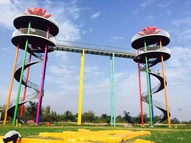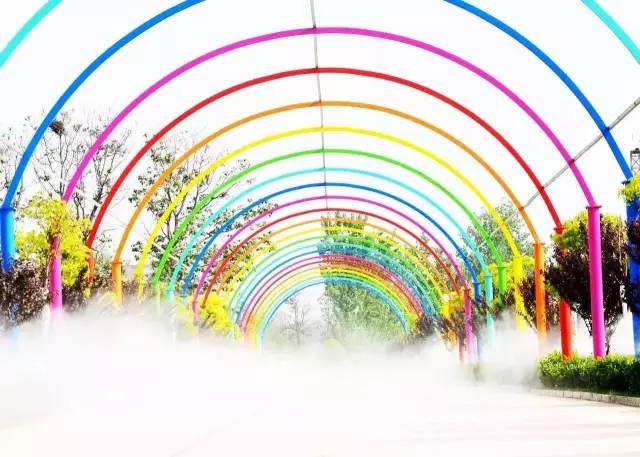 有彩虹大道、七彩花田、风雨彩虹、七彩莲花台、旱滑水滑、动漫水世界、水上拓展、沼泽逃生、窑居院、紫藤长廊等多种游乐休闲设施。