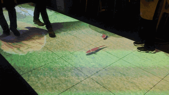 1层的地板上投射着出逼真的鱼塘幻境,来来往往的顾客都练就了“水上漂”的功力。