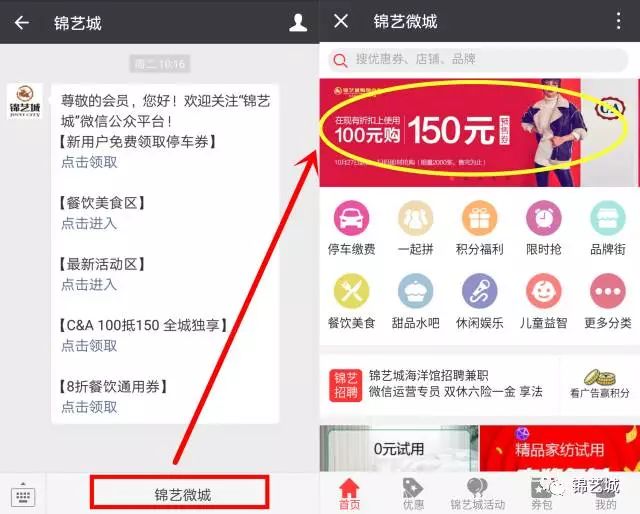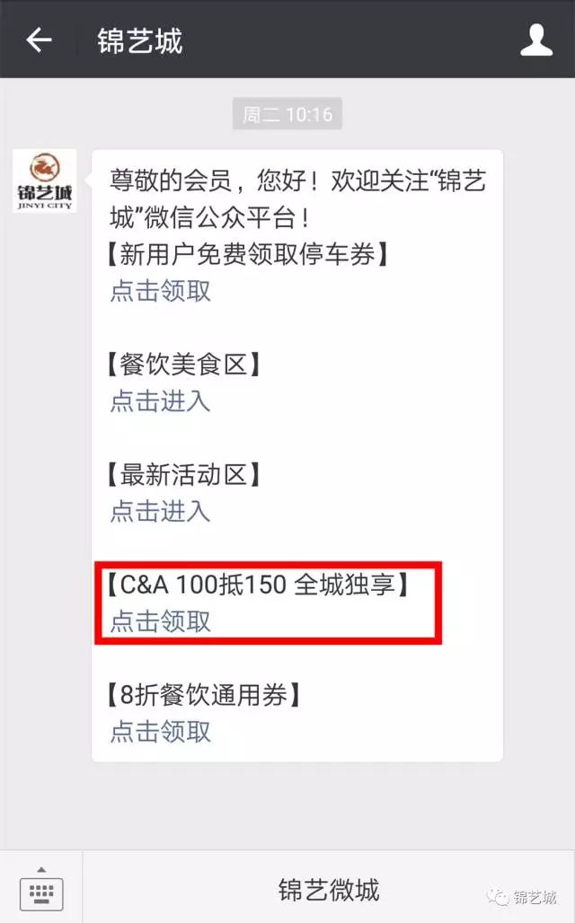 已关注他们官微的:点击“锦艺微城”——首页轮播“C&A100购150元预售券”。