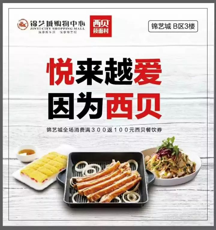 活动期间,锦艺城全场消费满300元送100元西贝莜面村餐饮抵用券1张。
