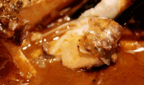 刚出锅的鱼头,汤汁微微发红、鱼皮酥烂。靠近鱼鳍位置的肉最嫩,入口即化。