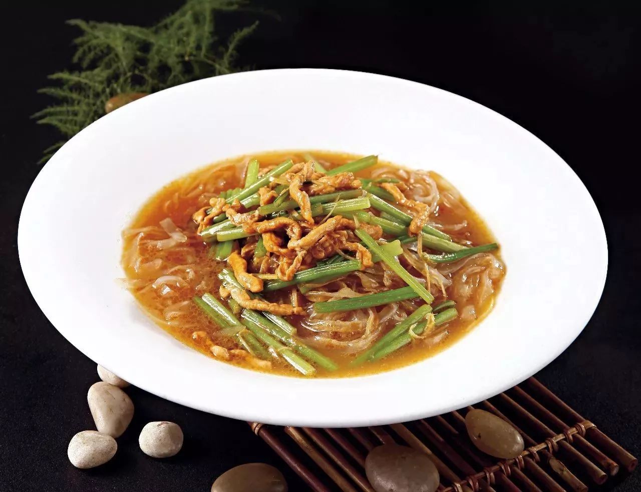 他说:“肉丝带底源自河南首个厨师之乡——长垣,是一道河南名菜,此菜可谓家常不寻常,选料十分考究,用长垣的手工绿豆粉皮和足年的山林跑养黑猪肉,酸辣适口,营养丰富。就像豫剧讲究声情并茂,豫菜讲究五味调和,两者可以说都是中国文化的瑰宝。”