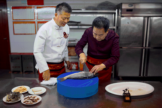 “抽腥线”“懒七勤八”“刀下生花”,豫剧名家李树建老师,一边体验做鱼的乐趣,一边听樊胜武先生讲解“阿五红烧黄河鲤鱼”的标准制作流程,一边感慨厨艺的精湛和美妙,亦如戏曲。